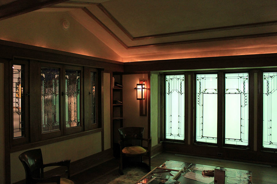 Backlit Art Glass in the Recreation of a Frank Lloyd Wright Space Photo by: Ryan Linton