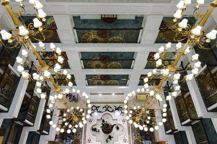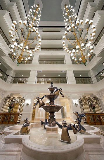 Visitors are greeted at the Porte Cochere with a Victorian Era custom chandelier that GWA designed in-house using reference fixtures from elsewhere at the resort. Pathway, parking and entry drive lighting fixtures are all decorative elements that match the aesthetic. Even the upgrades at the courtyard pool where done with the decorative fixtures using a combination of new lamps and upgraded optics. Inside the new building, the white surfaces of the lobby glow with even illumination from integrated LED downlights. The centerpiece of the lobby is a fountain featuring characters from Mary Poppins. This is centered in an 80’ tall atrium space where accent lights are tucked at the perimeter. A pair of elaborate 40’ tall chandeliers fill the volume and greet guest views at every floor. Guest rooms are adorned with decorative fixtures, recessed LED art lighting and concealed shower slots all intended to give guests the quality of light expected with a 5-star resort.