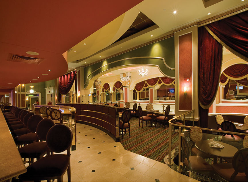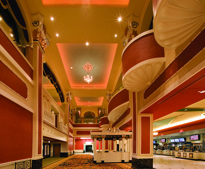 Visitors are greeted at the Porte Cochere with a Victorian Era custom chandelier that we designed in-house. The white surfaces of the lobby glow with even illumination. The centerpiece of the lobby is a fountain featuring characters from Mary Poppins. This is lit from accent lights in the 6 story atrium above, whose space is filled with two elaborate chandeliers. Corridors are lit with alternating wall sconces and art lights. Typical rooms and Grand Villas are adorned with decorative fixtures, lighted coves as well as ambient light provided by downlights.