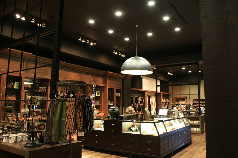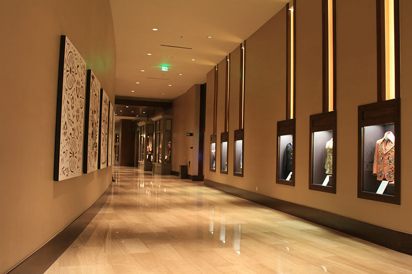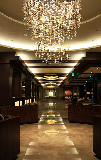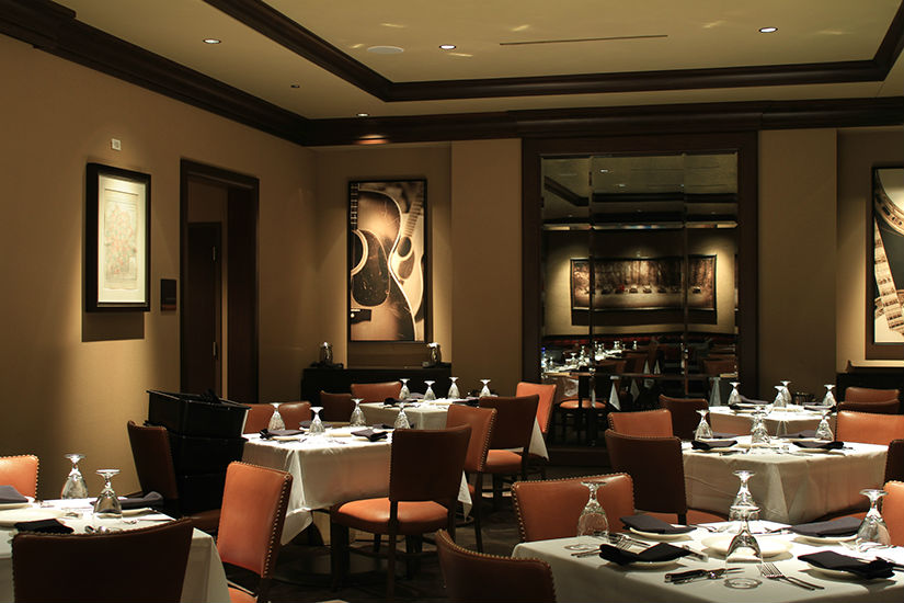 Many of the musical lighting elements were subtle, or made sense in term of a plan view of the building, but may not be easily perceived in the space. This included the idea that the lobby ceiling recalled the shape of a guitar. This design would include long linear coves on either side, and the ceiling broken up into frets, denoted by decorative fixtures. At the end of this linear section would be the "sound hole" which would be marked by a large decorative piece and a seating area.