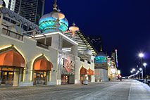 A detailed, cohesive, exciting façade was created across this long beachfront property. All color changing light fixtures at domes and roof elements were tied together to a single dmx control system to allow changes for events, seasons or otherwise. White light features work as subtle accent to create a glow for cornices , subtle wallwashing or as outlines for the middle eastern shapes. At the main entrance, new white LED nodes were installed around the new signage. These nodes are individually addressable to create sparkle effects throughout the night drawing attention to the entry and hinting to the excitement inside the casino. Together with the revitalized decorative fixtures, all of the additional lighting uses 25% less power than the previous design. GWA Lighting conceived the new design, fixture selections and programming choices for the project from start to finish.
