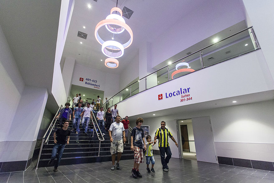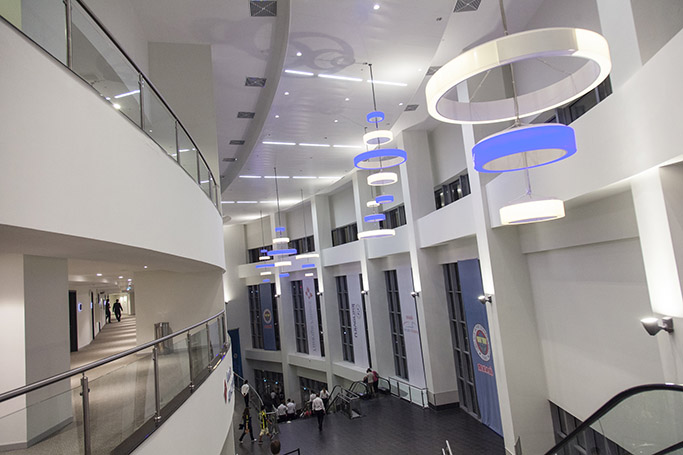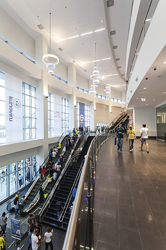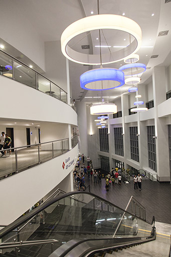 Visitors are greeted at the Porte Cochere with a Victorian Era custom chandelier that we designed in-house. The white surfaces of the lobby glow with even illumination. The centerpiece of the lobby is a fountain featuring characters from Mary Poppins. This is lit from accent lights in the 6 story atrium above, whose space is filled with two elaborate chandeliers. Corridors are lit with alternating wall sconces and art lights. Typical rooms and Grand Villas are adorned with decorative fixtures, lighted coves as well as ambient light provided by downlights.